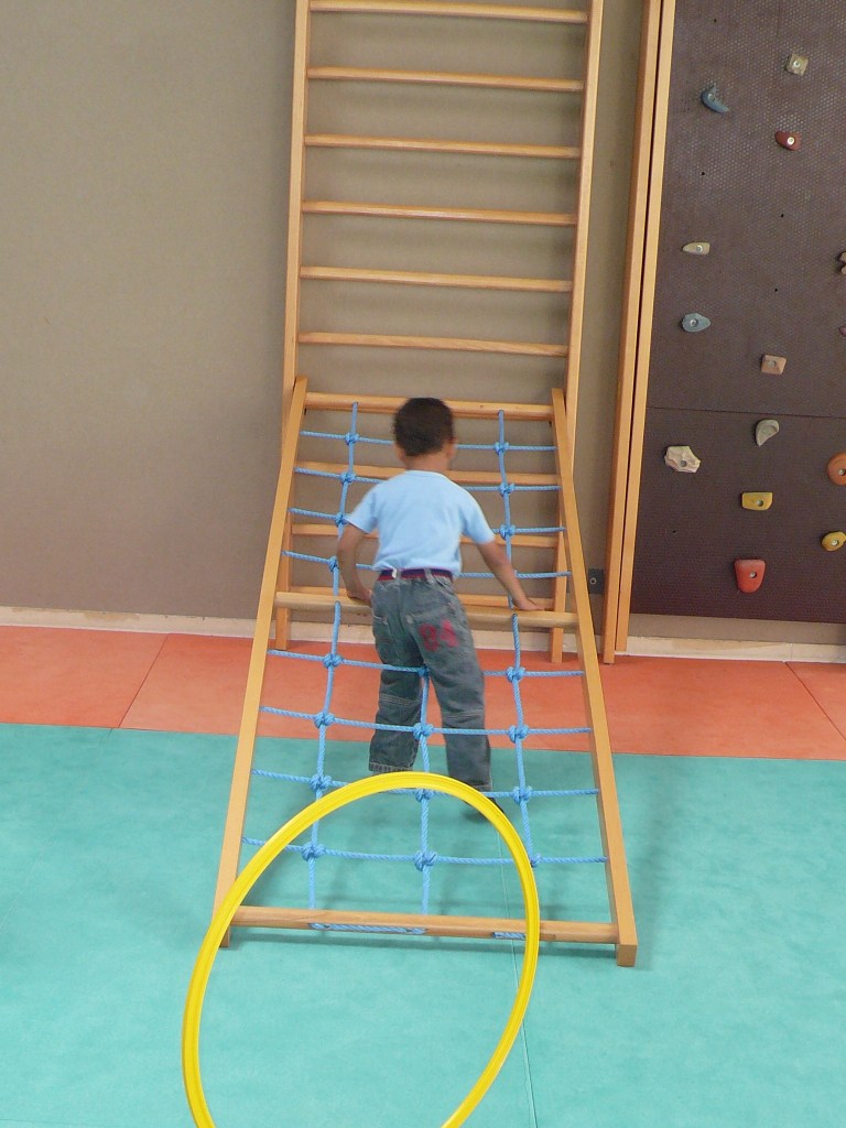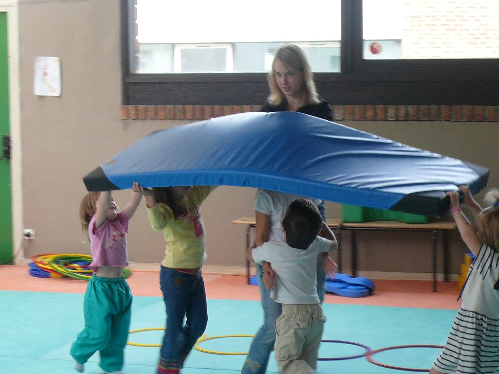 Dans un premier temps (au moins jusque Noël), la psychomotricienne laissera évoluer les enfants librement dans la salle, découvrir le matériel (toboggan, trampoline, cerceau…), l’activité. Les enfants ont besoin de faire des expériences pour découvrir leur corps, leurs capacités. Il y aura cependant des temps de socialisation marqués par un regroupement (début/fin de séance) autour d’une comptine à gestes.